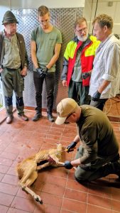 Teilnehmer des handwerklich anspruchsvollen Lehrgangs waren zehn passionierte Jäger des Kreisjagdverbandes Lindau e.V. (Herbert Bohle, Oliver Eschbaumer, Martin Fritsche, Martin Gomm, Karl Hehle, Christoph Kling, Siegfried Kistler, Martin Schuleit, Jonathan Stahl und Florian Ulich) sowie vier Mitwirkende (Jürgen Hägele, Stefan Schönberger, Stefan Hägele und Rudolf Fritze). Unter der fachkundigen Anleitung der erfahrenen Experten Jürgen Hägele und Stefan Schönberger wurden zwei Rehe schonend aus der Decke geschlagen und bis zur küchenfertigen Zerwirkung präzise zerlegt.
